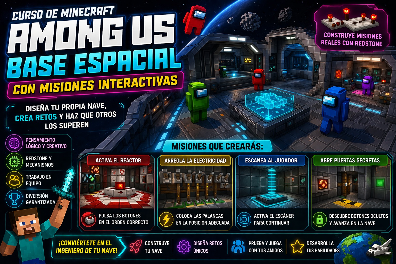 Los participantes construirán una nave espacial interactiva compuesta por diferentes salas, cada una con una “misión” o reto que debe completarse mediante la interacción con